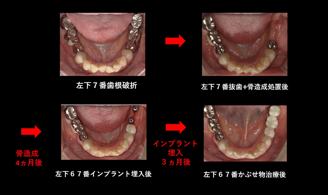 左下7番が咬合による過負荷のため歯根破折を起こし、ブリッジかぶせ物を除去し7番抜歯時に骨造成処置を事前に行いました。