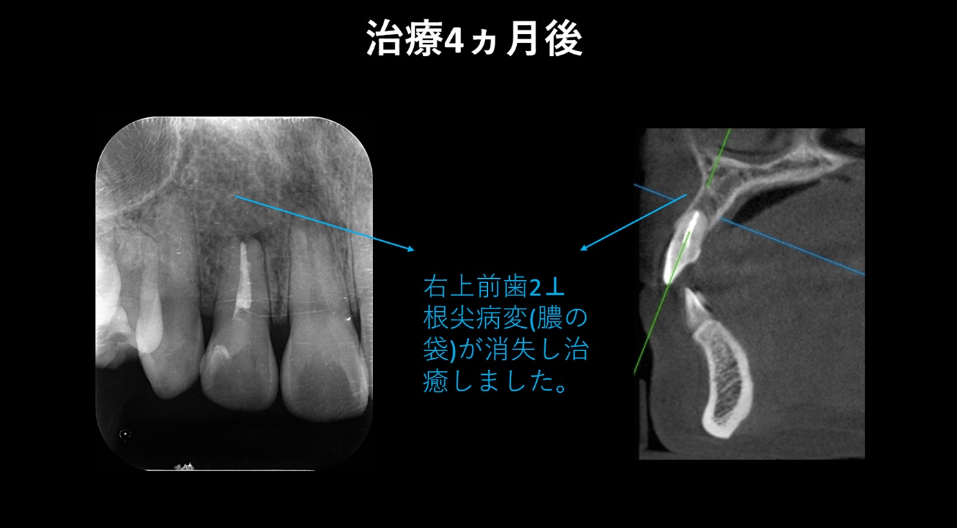 ↑ 根管治療から 4か月後の経過観察 では、歯の根の先にあった 根尖病変は消失し、良好な治癒が確認できました。